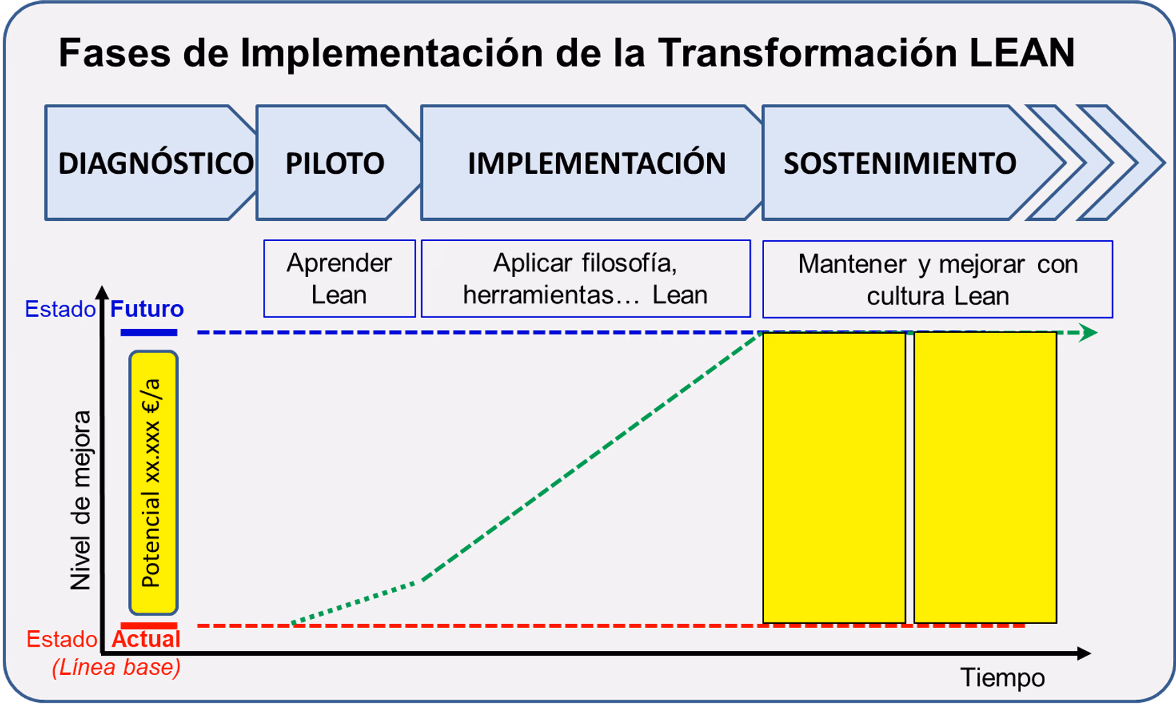 Con Lean ocurre algo similar. Una de las herramientas Lean básicas es la estandarización. Pero no basta con implantar estandarización en toda una fábrica, con toda su sistemática de herramientas como SOS (Standard Operation Sheet), LUP (Lección de Un Punto), etc., si no se tiene en cuenta que hace falta sostenerlo en el tiempo. Esto implica, por ejemplo, auditar con una sistemática Lean, tener indicadores (KPIs) o conectar con otras herramientas Lean como RFT (Right First Time, Bien Hecho a la Primera), para que los beneficios alcanzados con tanto esfuerzo se mantengan, se sostengan.